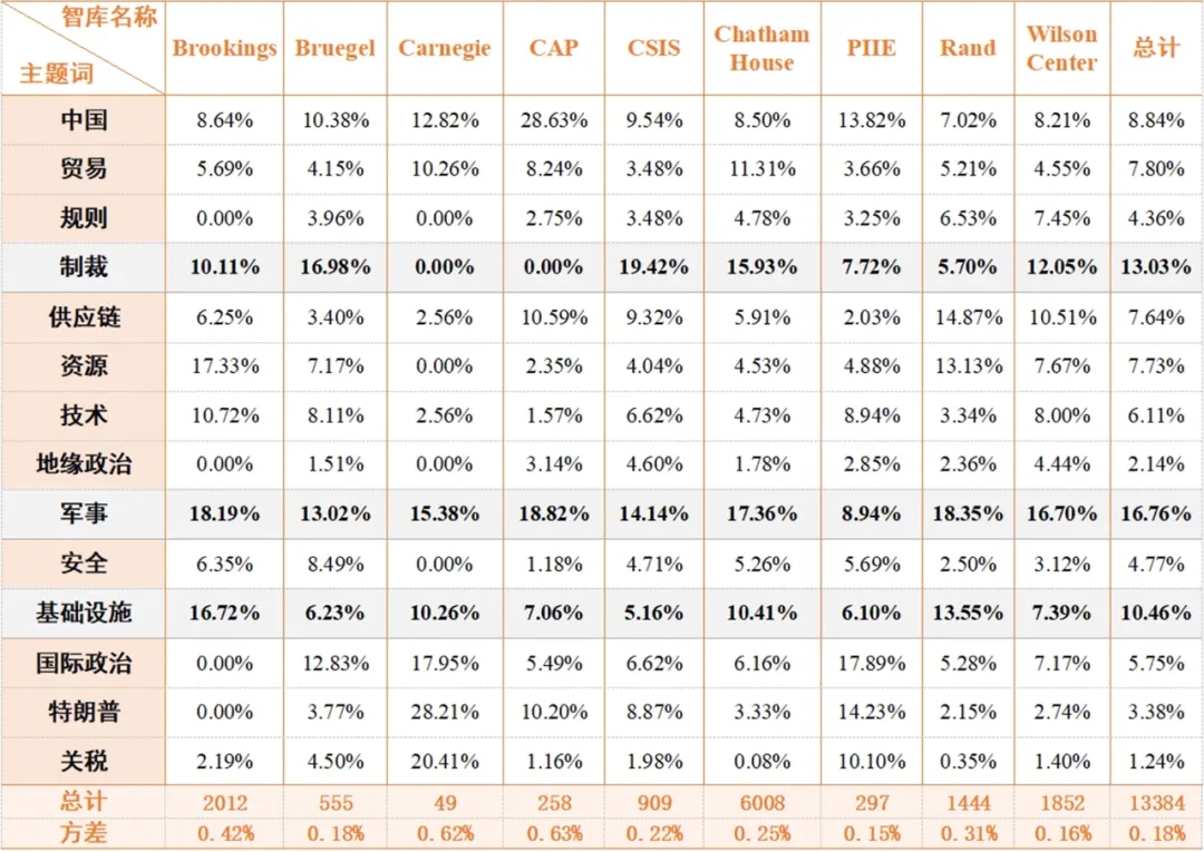 2024年美欧高端智库报告分析(下篇) ——基于13384篇报告的大数据分析 王一童 柴亚超 童天乐 一、研究背景 2024年下半年,全球政治经济局势呈现出稳中求变、变中求进的复杂调整态势,尽管面临多重挑战,但2024年全球经济继续缓慢复苏,制造业景气度逐步修复,通胀压力有所缓解,国际贸易呈现回升迹象。与此同时,全球正经历以数字化、人工智能为驱动的深刻变革,新兴技术加速重构产业格局,清洁能源产业链和关键矿产资源成为大国战略博弈的新焦点。在应对气候变化背景下,各国加速推进能源转型,由于不可再生能源产业链和供应链安全问题日益凸显,美欧国家力图通过立法和政策强化关键矿产本土化战略,围绕锂、钴等战略性资源展开激烈竞争。 在错综复杂的国际形势中,深入分析和准确判断当前和今后一个时期国际形势的基本特征和演变趋势,有助于我们准确把握先机、掌握战略主动、有效应对风险。美欧智库凭借深厚研究积淀和广泛影响力,其政策分析报告已成为透视政府决策逻辑和社会舆情的重要窗口。值得注意的是,全球经济复苏仍存在区域不平衡,亚洲制造业采购经理指数(PMI)持续扩张而欧美呈现疲软态势,叠加地缘政治冲突和贸易保护主义因素,经济温和复苏中波动风险显著。面对多极化趋势深化和产业链重构,加强国际合作与结构性改革成为各国应对挑战的共同选择。在此背景下,统筹把握技术创新、资源安全与全球治理之间的互动关系,对实现我国可持续发展具有关键意义。 2022年以来,中咨公司持续跟踪美欧智库研究动向,对美欧智库全量报告文本进行大数据分析,本报告属于美欧智库成果大数据研究系列。全面了解美欧国家对国际政治、经济贸易、中国发展等关键领域的认知情况,可助力我国政府决策部门及时研判美欧国家对我国的政策战略意图,结合国内实际情况制定应对策略,提升我国信息情报领域的决策参考服务水平。 二、样本选取 研究样本选取美国布鲁金斯学会(Brookings.Brookings Institution)、美国卡内基国际和平基金会(Carnegie.Carnegie Endowment for lnternational Peace)、比利时布鲁盖尔研究所(Bruegel)、美国战略与国际问题研究中心(CSIS.Center for Strategic and International Studies)、英国皇家国际事务研究所(The Royal Institute of International Affairs,又称查塔姆社:Chatham House)、美国兰德公司(Rand)、美国彼得森国际经济研究所(PIIE.Peterson Institute for International Economics )、伍德罗·威尔逊国际学者中心(Woodrow Wilson International Center for Scholars,简称威尔逊中心:Wilson Center)和美国进步中心(CAP.Center for American Progress)等9家智库。 样本报告涵盖国际政治、地缘政治、中国、军事、科技、安全、贸易、供应链、规则、资源、基础设施建设、特朗普、制裁等相关关键词的研究报告,共计13384篇。 三、文本数据分析 (一)各智库关注领域 据统计,2024年下半年,美欧智库中聚焦安全、科技、国际政治等议题的研究报告占比在五分之二左右;聚焦中国、资源、制裁等议题的研究报告占比在四分之一左右;聚焦贸易、规则、军事、地缘政治等议题的研究报告约占五分之一;聚焦基础设施建设、相关供应链、特朗普政府、对等关税等议题的研究报告约占八分之一。 1.威尔逊中心 威尔逊中心聚焦国际政治与规则研究,指出在全球技术竞争深化的当下,美国需构建强有力的技术联盟以巩固竞争力。威尔逊中心认为当前技术竞争已成为国家安全与经济安全的核心议题,面对中国等国家的挑战,美国必须通过联盟机制整合资源。这种协作不仅能推动技术创新,更可以在关键领域形成协同合力,有效应对包含网络安全、气候变化、经济不平等在内的全球性挑战。通过共享最佳实践与优化资源配置,美国得以在国际舞台上维护技术领导地位,实现战略目标与安全需求的平衡。 在国际规则塑造的研究中,威尔逊中心认为,国际政治在意识形态的斗争中发生了显著变化,“意识形态斗争” 转化为 “利益博弈”,这种转型既造成了国际秩序混乱,也孕育着新规则体系萌芽。特朗普政府将对华政策从 “价值观遏制”转向“经济脱钩+科技封锁”。对 TikTok的75天宽限期、稀土出口管制、半导体禁令等措施,本质是用商业手段实现战略目标。中国则通过区域全面经济伙伴关系协定(RCEP)深化区域经济合作,在二十国集团(G20)领导人峰会上提出“同球共济”理念,构建替代规则体系等措施予以应对。 2.布鲁金斯学会 布鲁金斯学会的研究领域较为广泛,被称为美国“最有影响力的思想库”,其研究相对侧重安全和贸易方面。布鲁金斯学会认为近几十年来基于原有的国际秩序面临挑战,尤其是美国在全球经济治理中的角色调整及其对国际规则的履约弱化造成其影响力不断下降。随着全球经济和政治环境的变化,国际规则基础秩序正遭遇越来越多的挑战,尤其是美国在这一体系中的领导地位受到质疑。特朗普执政后美国的单边行动和对国际规则的忽视必定导致他国反制性响应,进而削弱全球合作的基础。为了维护有效的国际秩序,各国需要共同努力,建立明确的规则和标准,以应对新兴的地缘政治竞争和经济保护主义。只有通过合作和遵守共同的规则,才能确保国际关系的稳定与世界和平。 布鲁金斯学会通过大量分析全球贸易问题,提出美欧应加强国际合作以应对全球挑战。国际合作在应对全球性挑战中
