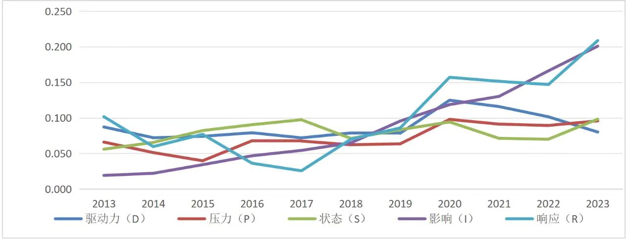 (二)九江市旅游生态安全各系统状况分析 依托所选指标的评价模型,将各指标进行标准化处理后数值乘以相应的权重,计算出2013-2023年九江市旅游生态安全评价指标体系各系统的评价得分,并绘制出各系统评价得分动态变化图(如图2所示)。 图2 2013-2023年九江市旅游生态安全各系统评价得分 1.驱动力系统评价得分动态分析 2013-2023年期间九江市驱动力系统评价得分,总体呈现出先缓慢爬升后下降的趋势。由图2可知,驱动力系统评价得分由2013年的0.087上升到2021年的0.116,增幅约为0.029。其中,2020年驱动力系统评价得分达到研究期内最高的0.125,2023年回落到了0.08,主要原因是游客人数增长率和旅游收入增长率产期处于负数,新冠疫情结束指标由负转正,虽然游客数量的爆发式增长一定程度上推进旅游业的发展,但是旅游业发展对当地生态环境会产生冲击。与此同时,以人均GDP和第三产业增长率为代表的整体经济环境水平,处于持续提升的状态,对旅游基础设施建设的发展提出了更高的要求,协调旅游业发展和生态环境保护需要多角度协同发力。 2.压力系统评价得分动态分析 2013-2023年期间九江市压力系统评价得分,总体呈现波动上升的趋势。由图2可知,压力系统评价得分由2013年的0.066上升到2023年的0.096,增幅为0.03。十年来,九江市在环保治理方面取得了一定成效,颗粒物排放量和工业废水排放总量得到有效控制,表明九江市在工业能耗结构调整方面取得了一定的成效。其中,石油化工企业通过坚持减污降碳与提升绿色效益并重,不断优化生产工艺,显著降低了污染物排放水平。然而,其他环保治理负面指标仍处于较高水平,尤其是以钢铁生产为代表的工业企业,持续产生大量危险废物、冶炼废渣和粉煤灰等固体废物。数据显示,一般工业固体废物产生量从2013年的989万吨攀升至2022年的2187.3万吨,导致压力系统评价得分未能实现大幅增长。 3.状态系统评价得分动态分析 2013-2023年期间九江市状态系统评价得分,总体呈现波动上升的趋势。由图2可知,状态系统评价得分由2013年的0.056上升到2023年的0.098,增幅为0.042。在这方面起到促进作用的主要是A级旅游景区、限额以上住宿和餐饮业法人单位数量两个指标,其中限额以上住宿和餐饮业法人单位数量由2013年的61个上升到2022年的676个,以此为代表的旅游基础设施水平得到了大幅度提升。值得一提的是旅客运输量从2013年的每年12452万人,下降为2023年的每年3329万人,该项数据体现出了十年间游客出行方式的改变,更多地选择如自驾、徒步、骑行等公共交通工具之外的出行方式,这也对旅游业发展提出了更多元化的要求。 4.影响系统评价得分动态分析 2013-2023年期间九江市影响系统评价得分,总体呈现持续上升的趋势。由图2可知,影响系统评价得分由2013年的0.019上升到2022年的0.201,增幅为0.22,在五大评价系统中增幅最大。文化旅游体育与传媒财政支出由2013年的每年43382万元上升到2023年的每年159504万元,该指标体现了政府部门对旅游业的高度重视;2019年11月,九江市发布了《关于支持现代服务业高质量发展若干政策措施的意见(70条)》,提出要大力发展旅游、商贸、康养体育等生活性服务业。2013年旅游业企业营业额和第三产业从业人数分别为84196万元和6697人,到了2023年提高到了582452万元和17992人,这是旅游市场对整体大环境的正向反馈。 5.响应系统评价得分动态分析 2013-2023年期间九江市响应系统评价得分,总体呈现先下降再大幅度上升的趋势,由图2可知,评价得分由2013年的0.102先跌落至2017年的0.026,再上升到2023年的0.209,总体增幅为0.107。2013-2017年期间,响应系统呈下降趋势的主要原因是2013年城市环境空气优良天数和环保投资占GDP比重分别从342天和16.7%,下降到了2017年的288天和0.15%,在此期间,九江市先后制定了《九江市A级旅游景区和乡村旅游点服务质量提升工作实施方案》《全市文化旅游市场秩序综合整治“春雷行动”方案》《九江市文化和旅游行业信用分级分类监督管理办法(试行)》等文件;到了2021年,以上两项指标分别上升至338天和10.94%,与此同时,绿化覆盖面积也在逐年提高。 四、结论与建议 (一)结论 本研究以九江市为研究对象,基于当地社会经济、旅游产业及生态文明发展现状,构建了旅游生态安全评价指标体系。研究采用熵权法和TOPSIS法相结合的评价方法,对2013-2023年九江市旅游生态安全水平进行了系统测算。研究结果表明,九江市旅游生态安全水平呈现“风险级-恶化级-风险级-敏感级-临界安全-一般安全”的演变趋势,整体呈现持续改善态势。研究发现,九江市旅游生态安全各系统均实现不同程度提升,表明该市在旅游生态安全管理方面取得了一定的成效。 从系统层面分析,影响系统和响应系统的评价得分增幅最为显著。影响系统得分的显著提升,反映了政府在文化旅游体育与传媒领域的财政投入对旅游生态安全的正向推动作用;响应系统与其他系统的紧密关联性,体现在城市环境空气质量改善和环保投资强度提升对其他指标的正向反馈效应;影响系统与响应系统的协同效应,充分体现了政府顶层设计和政策引导对旅游生态安全的系统性影响。 从要素层面分析,根据各指标权重排序,第三产业增长率、第三产业从业人数、限额以上住宿和餐饮业法人单位、万元 GDP 能耗、高等学校在校学生数等指标对旅游生态安全的影响